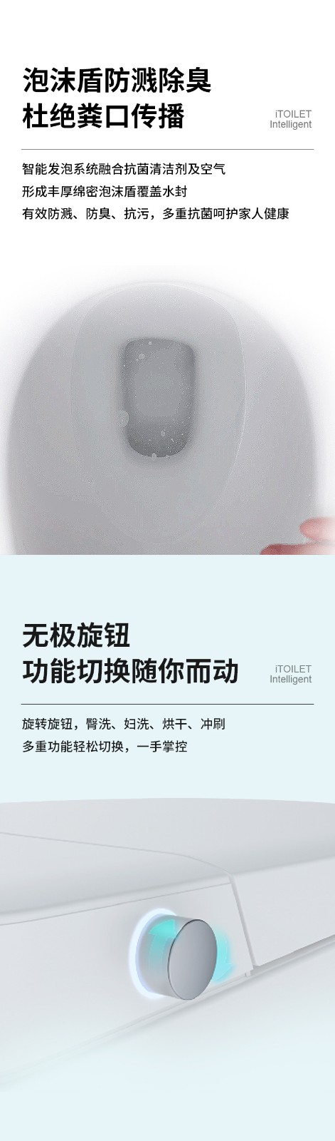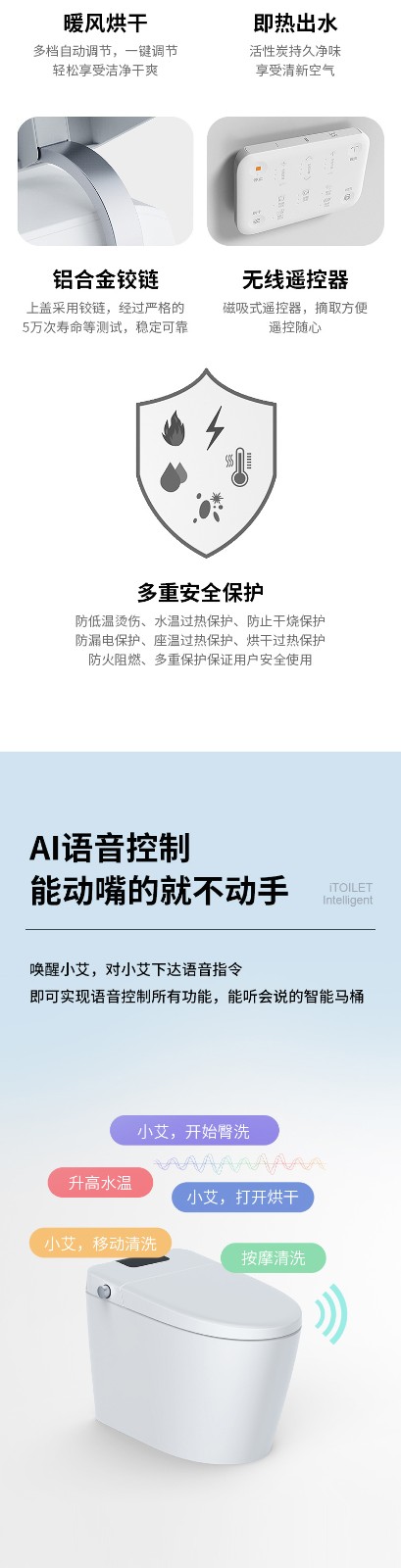 3、主要功能:AI語音控制(可選)、著座感應(yīng)、腳感翻蓋/翻圈/沖刷(可選)、停電(接USB)沖刷、暖風(fēng)烘干、無線遙控、凈味除臭、